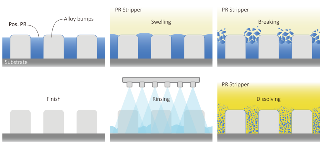 Photoresists remover is an NMP- / DMSO- / Non-NMP- / Non-DMSO- based mixture, and a ready-to-use standard remover for widely existing positive photoresist removing. In addition, it’s formulated for widely sensitive substrates use. It can be used in either wet bench or spray tool applications.